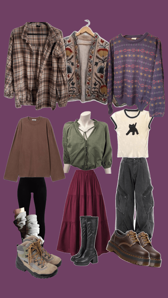 - Colors & Classics – The color of the season is purple which you can accent with various shades of green. Bonus points if you find a plaid flannel at the thrift store as plaid and flannel will always have a home in the fall season. And of course you can not go wrong with chunky knee high socks, bonus if you can pull off a pair of sheer socks.